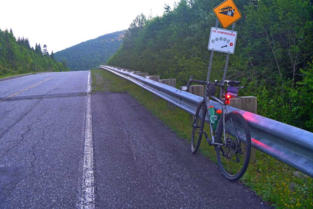 Note about gearing: it’s critical, when cycling in hilly places, to make sure you have a bike with the correct gears. My gravel bike has two front chain rings (50 and 34 teeth) and a rear cassette that stretches from 11 to 34 teeth. This means that my easiest gear is 34:34 (i.e. 1 to 1) ratio. I cycled up Mont-Mégantic using my 30 tooth rear gear (34:30 ratio: 1 turn of the pedals = 1.13 turns of my wheels, which are 700mm wheels with 38mm tires), but used the 34 rear gear (34:34 ratio: 1 turn of the pedals = 1 turn of the wheels) for Mont St.Joseph. Needless to say, on the descents I used my 50:11 ratio (1 turn of the pedals = 4.54 turns of the wheel), as well as making good use of the brakes to shave off excess speed. It’s easy to get up to 90km/h or more, but rather dangerous, so I kept things around 70. When descending one needs to be mindful of brakes overheating, so it’s better to brake hard, gather speed, brake hard again etc… than to continuously use the brakes (but be careful of other traffic or cyclists behind you). This allows the brakes to cool off a little. Going down hills without braking is also good for the brakes, but not so good for you or for anything you crash into.