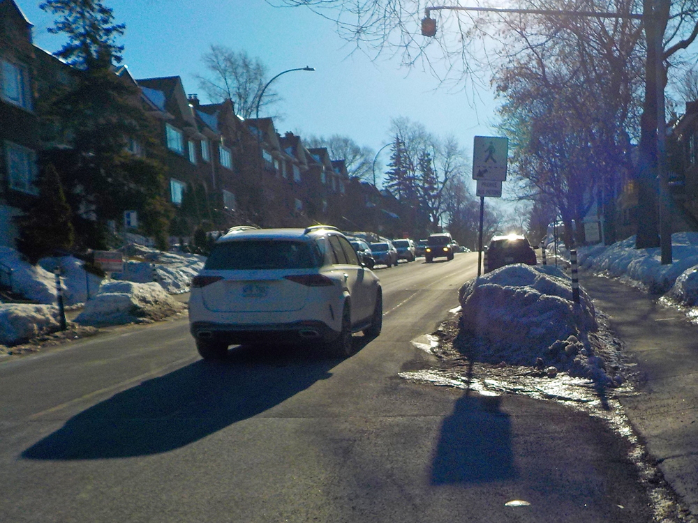 Fig 9. Ice ridge: I can’t cycle along a 3 inch icy ridge (even with a studded tire). It was left there by Côte-des Neiges snow ‘clearing’ on Lemieux St. So I move into traffic – the Montreal manoeuvre?