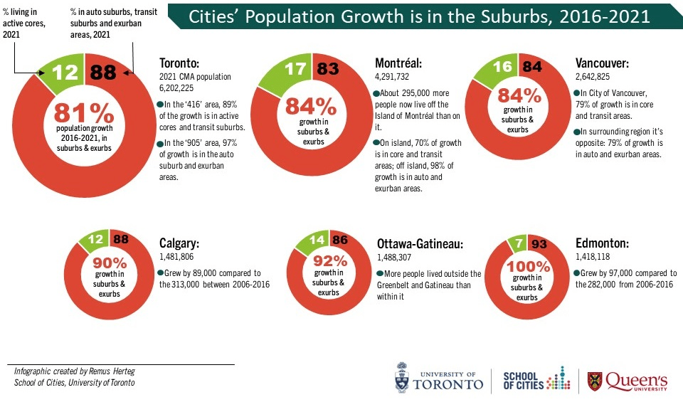 Between 2016 and 2021, 84% of Greater Montreal’s population growth was in suburbs and exurbs, places where a car is necessary to get around (this is how David Gordon and his team have defined suburbs and exurbs). Furthermore, only about 17% of the city’s total population lives in the walkable core, with a further 13% living in suburbs that have some transit use (typically low – but non-zero – and principally for regular commutes).